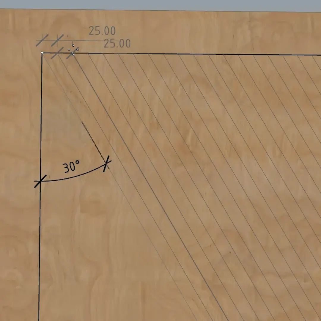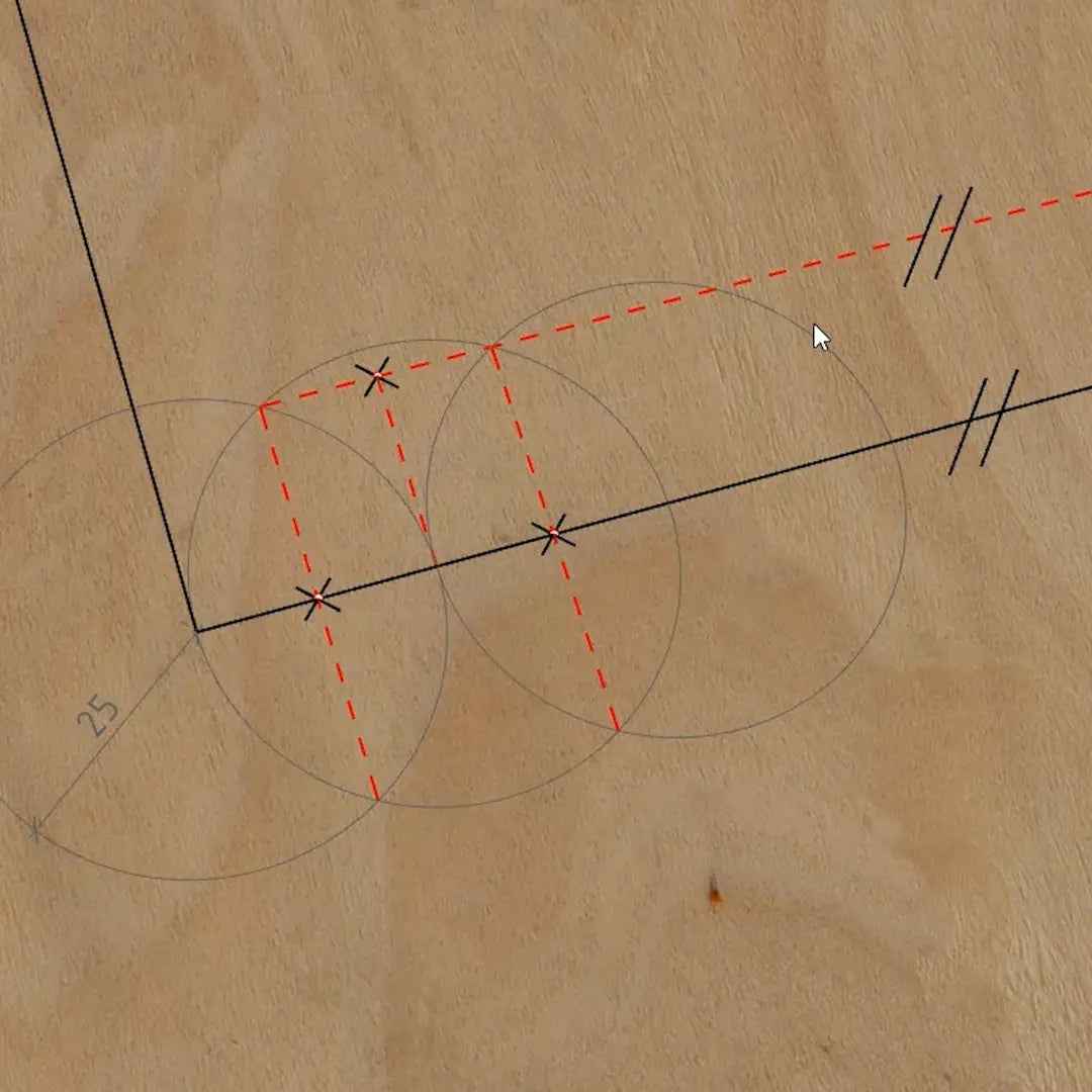 Draw this line, then draw parallel lines to it. The horizontal offset between them, measured along the bounding line, should be 25 mm.