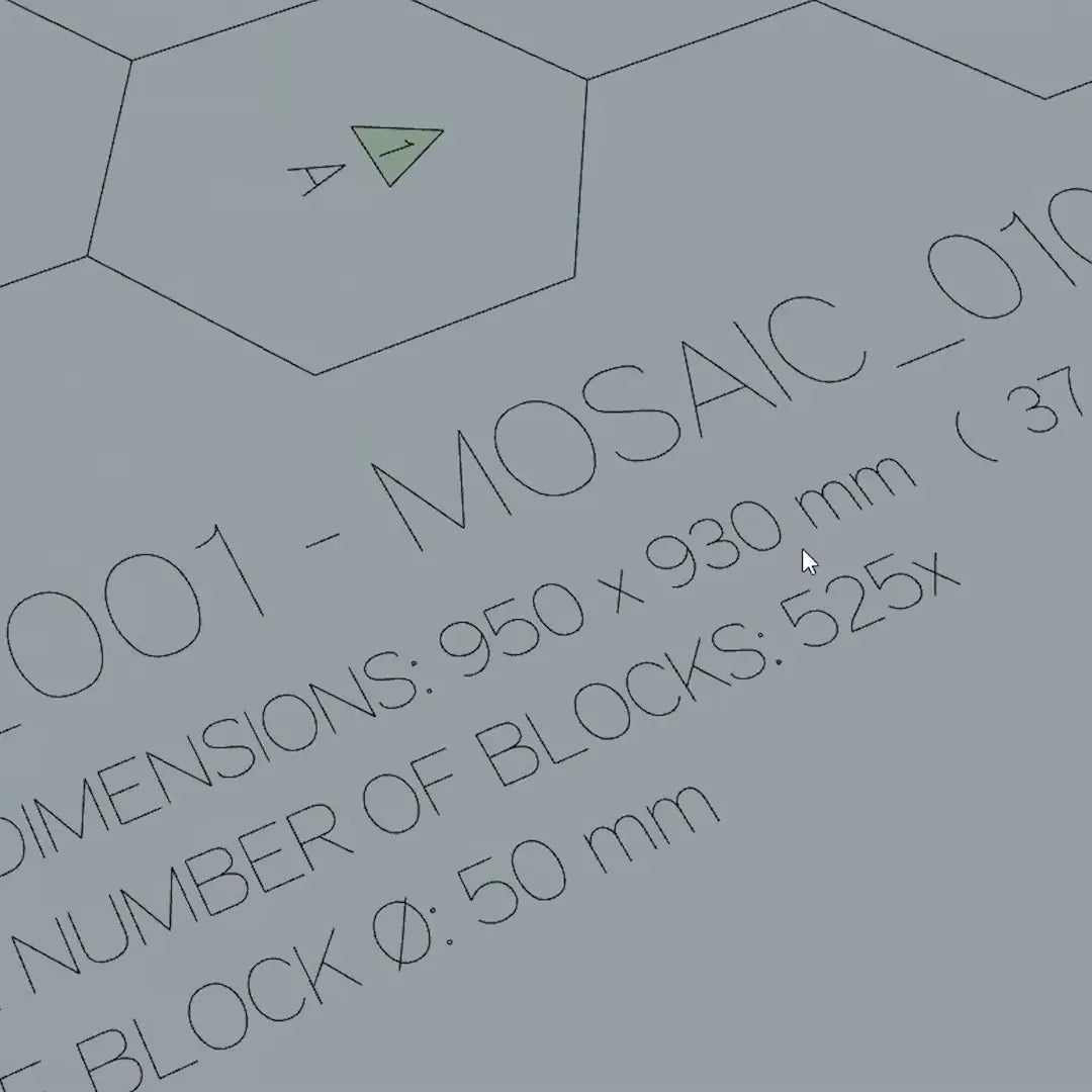 Every PDF layout includes dimension details. For example, the Mosaic – Layout #10 measures 950 mm × 930 mm. This rectangle represents the bounding area of the design. Another key measurement is the diameter of each block — in this case, 50 mm.