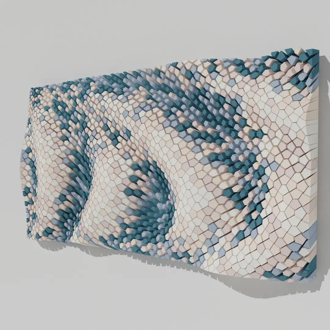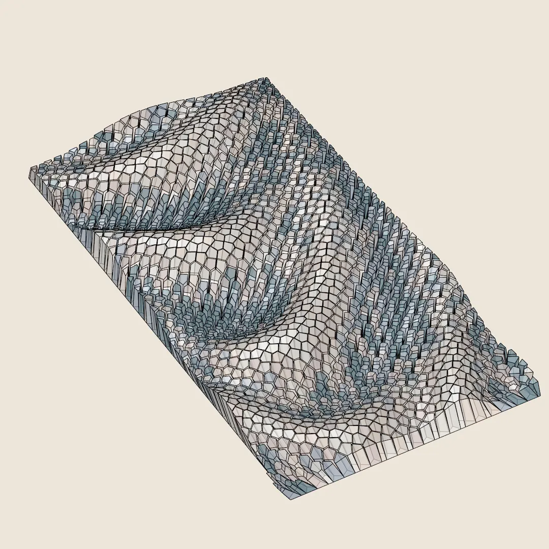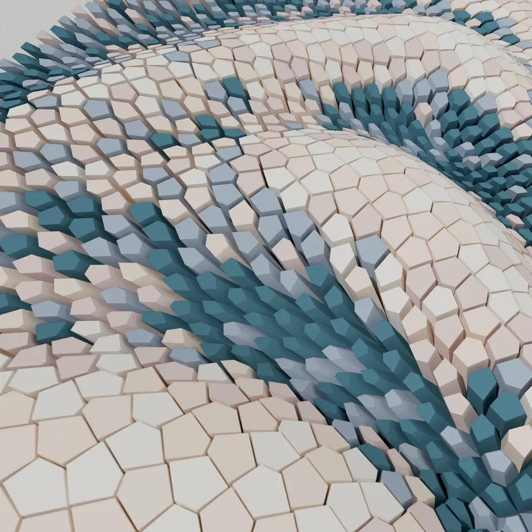 The geometry is built on a pentagon-based grid, but unlike previous Paragami pentagon-based structures, the blocks are angled rather than extruded straight up. This subtle shift creates a flowing rhythm across the surface, enhancing the sense of motion, depth, and wavering form.